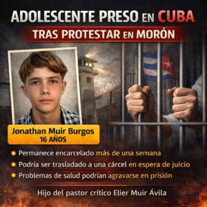 Jonathan Muir Burgos, a 16-year-old Cuban teenager, has remained imprisoned for more than a week after taking part in the March 13 protests in Morón. Activists and human rights groups warned that he may be transferred to Canaleta prison while awaiting trial. His family filed a habeas corpus petition, but they fear it will be rejected, along with any request for bail. The boy reportedly suffers from a serious skin condition that could worsen in prison because of poor medical care and unhealthy conditions. Supporters describe the case as retaliation against his father, Pastor Elier Muir Ávila, a well-known critic of the Cuban regime.