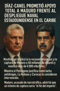 Díaz-Canel prometió apoyo total a Nicolás Maduro frente al despliegue naval estadounidense en el Caribe. Washington duplicó la recompensa por la captura de Maduro a 50 millones de dólares y movilizó más de 4,000 efectivos. Mientras el Pentágono lo justifica como lucha antidrogas, La Habana y Caracas lo consideran intervención. Maduro, acusado de narcotráfico, advirtió que un intento de captura sería “el fin del imperio”. La alianza Cuba-Venezuela se consolida en un contexto de alta tensión regional.