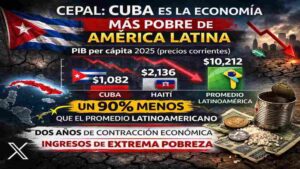 L’Annuario statistico 2025 della CEPAL colloca Cuba all’ultimo posto dell’America Latina e dei Caraibi per PIL pro capite a prezzi correnti e conferma due anni consecutivi di contrazione, mentre il resto della regione cresce. Il rapporto stima per il 2025 un PIL corrente di 12,0999 miliardi di dollari, pari a circa lo 0,2% del totale regionale, e un PIL pro capite di 1.082,8 dollari contro una media regionale di 10.212,2. Correggendo con prezzi costanti 2018, il PIL pro capite sale a 7.956,1 ma resta sotto la media. L’economista Elías Amor interpreta questi dati come segnale di un deterioramento strutturale accumulato e di un peso economico sempre più marginale.