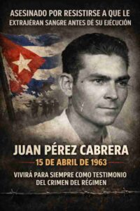 Juan Pérez Cabrera, de 36 años y opositor al gobierno cubano, fue asesinado el 15 de abril de 1963 en la prisión de Boniato, en Santiago de Cuba. Natural de Camagüey, pasó ocho meses oculto junto a un joven compañero de la resistencia en casa de su hermano. Al saber que serían delatados, intentaron huir hacia la Base Naval de Estados Unidos en Guantánamo para pedir asilo. Fueron capturados; el compañero, un joven de 18 años conocido como “Andrés”, murió baleado, y Juan fue brutalmente humillado obligándolo a ver y tocar la sangre de su amigo. Juan fue torturado durante tres meses de prisión. El día del fusilamiento se negó a que le extrajeran la sangre —práctica usada por el régimen para venderla— y fue ejecutado de un disparo en la frente. Dejó esposa y cuatro hijos. Fuente: José Bello