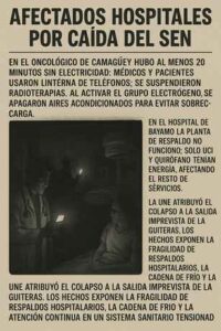 Several hospitals were affected by the fall of the SEN. At the Camagüey Oncology Hospital there were at least 20 minutes without electricity: doctors and patients used phone flashlights; radiotherapies were suspended. When the generator group was activated, air conditioners were turned off to avoid overload. At the Bayamo Hospital, the backup plant did not work; only ICU and operating room had power, affecting the rest of the services. UNE attributed the collapse to the unforeseen outage of Guiteras. The events expose the fragility of hospital backups, cold chain and continuous care in a health system strained by resource shortages and poor maintenance.