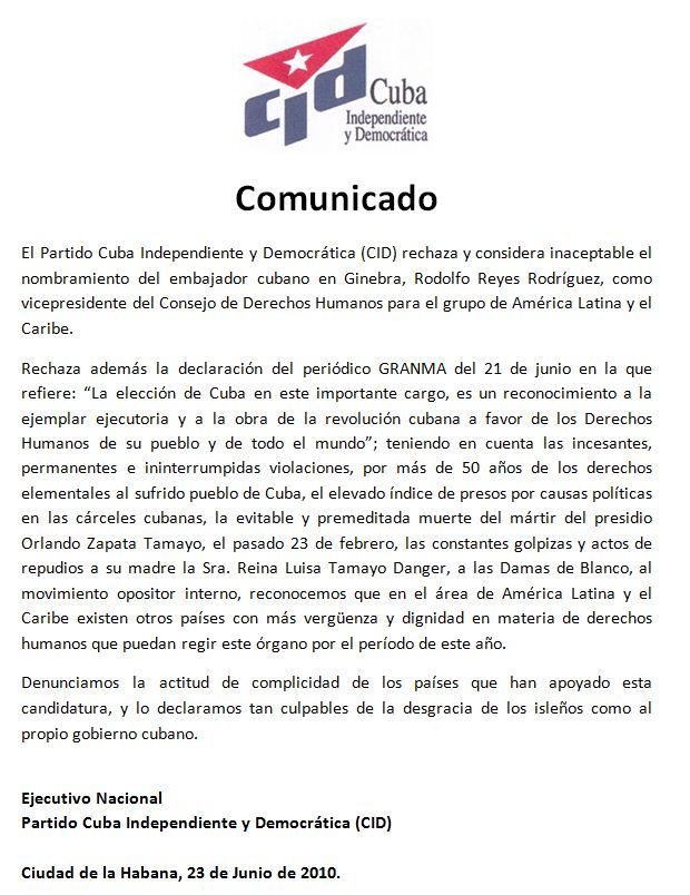El Partido Cuba Independiente y Democrática (CID) rechaza y considera inaceptable el nombramiento del embajador cubano en Ginebra, Rodolfo Reyes Rodríguez, como vicepresidente del Consejo de Derechos Humanos para el grupo de América Latina y el Caribe.