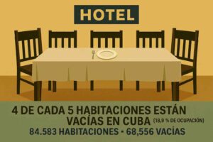 La ONEI reportó una ocupación hotelera del 18,9% entre enero y septiembre, equivalente a cuatro de cada cinco habitaciones vacías. Los ingresos cayeron 12,1% y la llegada de turistas disminuyó 20,5% en comparación con 2024. Esta tendencia hace inviable alcanzar la meta oficial de 2,6 millones de visitantes y compromete incluso superar los 2,2 millones del año anterior. La caída afecta también a los cubanos residentes en el exterior (-20,7%). El derrumbe responde a la crisis económica, apagones, deterioro de servicios, reducción de vuelos y sanciones de EEUU.