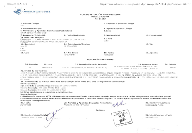 La Aduana de dictadura decomisó a Katia Sonia Martín Véliz, Corresponsal de la Revista Misceláneas de Cuba en la Isla, 10 ejemplares, informando por correo certificado a su domicilio ubicado Santo Tomás # 359 azotea entre Árbol Seco y Retiro, municipio Centro Habana.