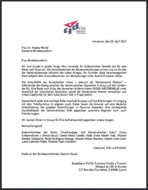El partido Cuba Independiente y Democrática envió una carta a la Dra. Angela Merkel, Canciller de Alemania, en la que se analiza el secretismo y el impacto de un viaje a Cuba del Ministro de Relaciones Exteriores alemán Guido Westerwelle.