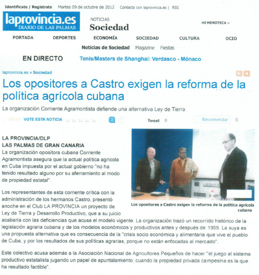 El pasado 8 de octubre en el auditorio Teatro Prensa Canaria en las Palmas de Gran Canaria, se efectuó la Conferencia-Testimonio sobre el Proyecto de Ley de Tierra y Desarrollo Productivo en Cuba, que han propuesto los dos juristas independientes cubanos el Dr. René Gómez Manzano y el Dr. Ernesto García Díaz, miembros de la Corriente Agramontísta de Cuba. El Dr. García es el Coordinador de Política Agraria del partido Cuba Independiente y Democrática (CID).