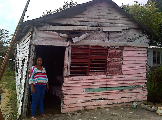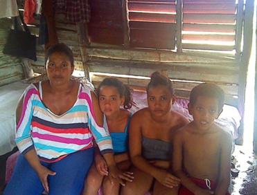 Vivo en la dirección mencionada con mis cuatro niños menores de edad, mi vivienda es de madera y posee peligro de derrumbe lo que pone a su vez en peligro la vida de mis hijos y la mía, no tiene servicios sanitarios (baño) cuando llueve se moja por las paredes y el techo, no tengo equipos electrodomésticos, el piso está en mal estado, las camas y colchones están en total deterioro, no tengo empleo ni puedo trabajar debido a no tener quien me cuide mis hijos, además se enferman de forma frecuente ya que padecen de asma bronquial, no tengo entrada económica y la chequera o ayuda social que tenia de 175.00 pesos (equivalente a $7US dólares) la retiraron alegándome que mi padre podía mantenerme con su jubilación de $200.00 M/N, el cual no vive conmigo.