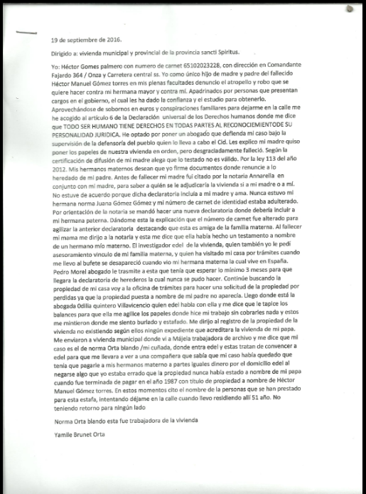 Yo: Héctor Gomes Palmero con dirección en Comandante Fajardo 364, entre Onza y Carretera Central. Cómo único hijo de madre y padre del fallecido Héctor Manuel Gómez Torres en mis plenas facultades, denuncio el atropello y robo que se quiere hacer contra mi hermana mayor y contra mí.