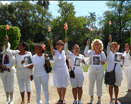 Miembros del CID: Marta Rondon (Banes) Carida Caballero (Holguín) Aimé Cabrales y Katia Martín (La Habana)Más de cuarenta Damas de Blanco, gladiolos en manos y con fotos del mártir Orlando Zapata Tamayo marcharon el domingo 30 de enero, desde la Iglesia Santa Rita hasta un busto martiano para rendirle homenaje, intercalando sus frases y depositando sus flores a los pies del busto.