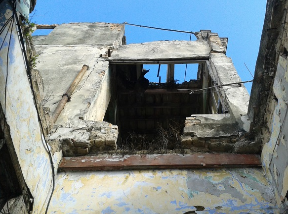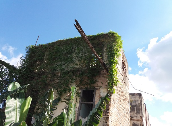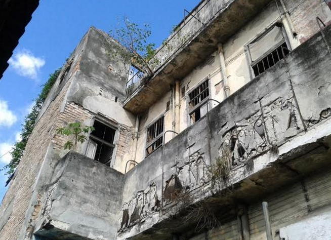 Hacemos llegar nuestra queja por la situación de este edificio que lleva décadas abandonado y en peligro de derrumbe, encontrándose muy afectada toda su estructura, parte de su cubierta y entrepisos presentan derrumbe parcial o total, de hecho sendas vigas de madera quedaron prácticamente al aire durante una demolición que efectuó la Empresa Servicios Especializados de la Construcción (SECONS) y jamás se concluyó, estas vuelan peligrosamente sobre las cubiertas de las viviendas colindantes así como sobre el patio de la escuela secundaria que se halla al fondo de la edificación, además de los trozos de repello y piedras sueltas que caen sobre nuestros tejados diariamente.
