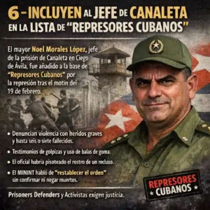 Major Noel Morales López, head of the Canaleta prison in Ciego de Ávila, was identified and added to the “Represores Cubanos” database for alleged responsibility in violent repression after a February 19 prison riot. Activists and groups such as Prisoners Defenders reported severe beatings and serious injuries, and cited audio claims suggesting six or seven deaths. Specific allegations include the use of rubber bullets at close range and an incident where Morales López was reportedly seen stepping on a prisoner’s face. Cuba’s Interior Ministry addressed the unrest more than 24 hours later, saying it restored order “with rationality and determination,” while not confirming or denying reports of fatalities and critically wounded inmates.