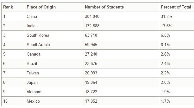 De casi un millón de estudiantes extranjeros en los Estados Unidos esta es la distribución de los 10 primeros países. Fuente: Institute of International Education.