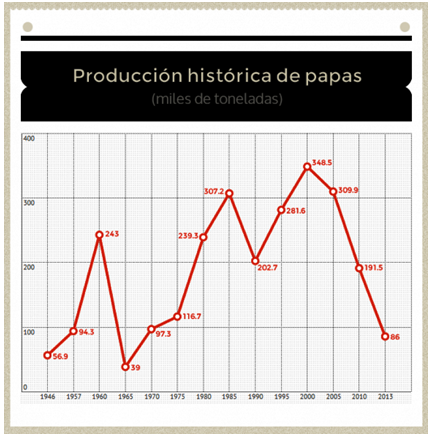 La inestabilidad en la distribución y venta es resultado del fracaso de su producción, debido a la interferencia del gobierno. En el 2013 se produjeron en Cuba menos papas que en 1957, 56 años antes. La gráfica adjunta es clara y se puede ver como la producción a partir de 1960 sube y baja: la segunda cifra a la izquierda en la línea roja corresponde a 1957; la última a la derecha, al 2013. Como se puede observar, queda por debajo de la de 1957. Esos son los éxitos de la “reforma agraria” de la dictadura: producir ahora menos papas que en 1957, a pesar de gastar mucho más dinero importando semillas, fertilizantes y pesticidas.
