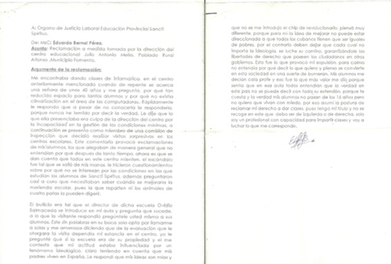 Esto fue lo que provocó mi expulsión; para colmo no entendía por qué decir lo que quiero y pienso se convierte en esta sociedad en una suerte de bumerán. Mis alumnos me decían, cala profe y eso fue lo que más valor me dió, porque sentía que en esa aula todos entendían que la verdad en este país no se puede decir en todo su extensión, porque te cuesta, y la verdad mis alumnos no pasan de los 16 años, pero no quiero que vivan con miedo, por eso asumí la postura de reclamar mi derecho a dar clases, pues tengo mi título y no se recoge en este que debo ser de izquierda o de derecha, solo soy un profesional con capacidad paro impartir clases y voy a luchar lo que me corresponde.