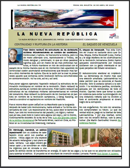 La Nueva República se distribuye las delegaciones del CID en Cuba pero usted puede tomarse la libertad de hacerlo en cualquier parte, colaboracion que anticipadamente agradecemos. En esta direccion usted puede bajar el archivo de PDF de esta edicion. Gracias