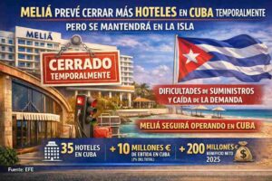 Meliá planea cerrar temporalmente más hoteles en Cuba, sumándose a tres ya clausurados, sin contemplar salir del país donde gestiona 35 establecimientos. La empresa atribuye la “compactación” a dificultades de aprovisionamiento —incluido combustible—, problemas de transporte del personal y caída de la demanda. Señala que los cierres responden a niveles de ocupación y a limitaciones de suministros. Aun así, mantiene que Cuba tiene fuerte potencial y afirma sentirse cómoda con su liderazgo en el mercado. La compañía reportó en 2025 más de 200 millones de euros de beneficio neto y un ebitda de 544,7 millones; de Cuba provendría alrededor del 2% del ebitda, algo más de 10 millones de euros.
