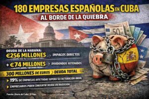 A report from Spain’s Commercial Office in Havana, cited by El País, estimates the Cuban government’s debt to Spanish companies at around €300 million. The document details €256 million in direct unpaid debts and another €74 million retained in dividends or non-transferable accounts. Of 930 companies operating in Cuba, only 182 provided data, suggesting that nearly 180 may be undergoing insolvency proceedings due to unpaid obligations. Nineteen percent reported that the debt exceeds their annual revenue, mainly affecting small and medium-sized enterprises. Business leaders have proposed converting debt into productive investment through Spanish financial conversion programs to recover part of accumulated losses.