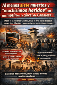 A riot at the maximum-security Canaleta prison in Ciego de Ávila reportedly left at least seven people dead and many others injured, according to Prisoners Defenders and witness accounts. The disturbance allegedly began after a very young inmate protested because he was not being given food and could not endure hunger any longer; he was reportedly beaten and later found hanged in his cell. After that, prisoners reportedly rose up in protest. Witnesses say they saw seven coffins removed and several ambulances heading toward hospitals in Ciego de Ávila and Camagüey, while chants such as “Patria y Vida,” “down with Díaz-Canel,” and even “long live Trump” could be heard from outside. Reports describe a heavy security operation led by local prison authorities and reinforced units, including alleged use of rubber bullets, pepper spray, chemical agents, and severe beatings. Families’ communications were reportedly cut, and information came in slowly. Canaleta has long faced complaints of overcrowding, unsanitary conditions, and abuse. Authorities had not issued an official statement nearly a day after the incident.