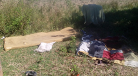 Colchoneta y ropa del joven al sol despuésde orinada para secarla frente a la pequeña casa