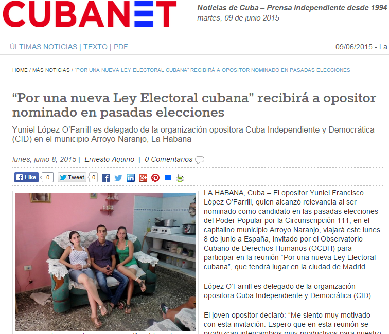 LA HABANA, Cuba – El opositor Yuniel Francisco López O’Farrill, quien alcanzó relevancia al ser nominado como candidato en las pasadas elecciones del Poder Popular por la Circunscripción 111, en el capitalino municipio Arroyo Naranjo, viajará este lunes 8 de junio a España, invitado por el Observatorio Cubano de Derechos Humanos (OCDH) para participar en la reunión “Por una nueva Ley Electoral cubana”, que tendrá lugar en la ciudad de Madrid.