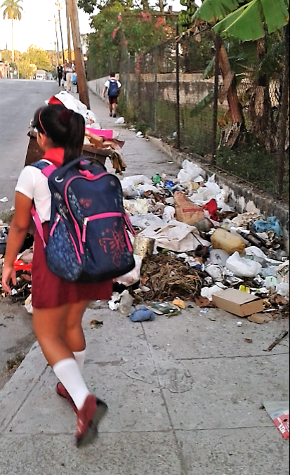 Continuamos reclamando durante meses, sin haber recibido aún la adecuada respuesta, a ninguna instancia, y mucho menos la acción específica en la mejora de los ciclos de recogida por parte de la Empresa de Servicios Comunales de los desechos sólidos. La actual situación ha empeorado debido a un salidero de aguas negras que brota calle arriba y que al mezclarse con la basura crea un obstáculo incluso a la circulación de vehículos y al paso de peatones, incluyendo a los niños que deben pasar por esta esquina camino de su escuela.
