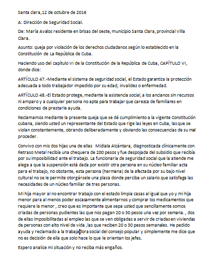 En las investigaciones que realiza el CID antes de denunciar o reclamar un caso, conocimos que uno de los argumentos que se le expusieron a las demandantes fue que existía otra persona en el núcleo familiar que estaba acta para trabajar y mantenerlas, motivos por los que los activistas de la Defensoría del Pueblo en Villa Clara, ademas de reclamarle esta injusticia al personal que representa la asistencia social del regimen, denunciamos la violación constante de los derechos humanos en Cuba, pues nunca se ha dado a conocer ante las tribunas internacionales que el salario de los discapacitados y jubilados en este país es tan mísero que no satisface las más mínimas necesidades humanas.